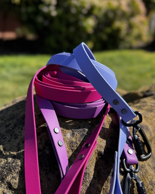 Built for adventure and made to last. Our premium lightweight, easy-to-clean BioThane leashes are waterproof, stink proof, and antimicrobial. Each piece is custom made to order at our workshop in Oakland, California.