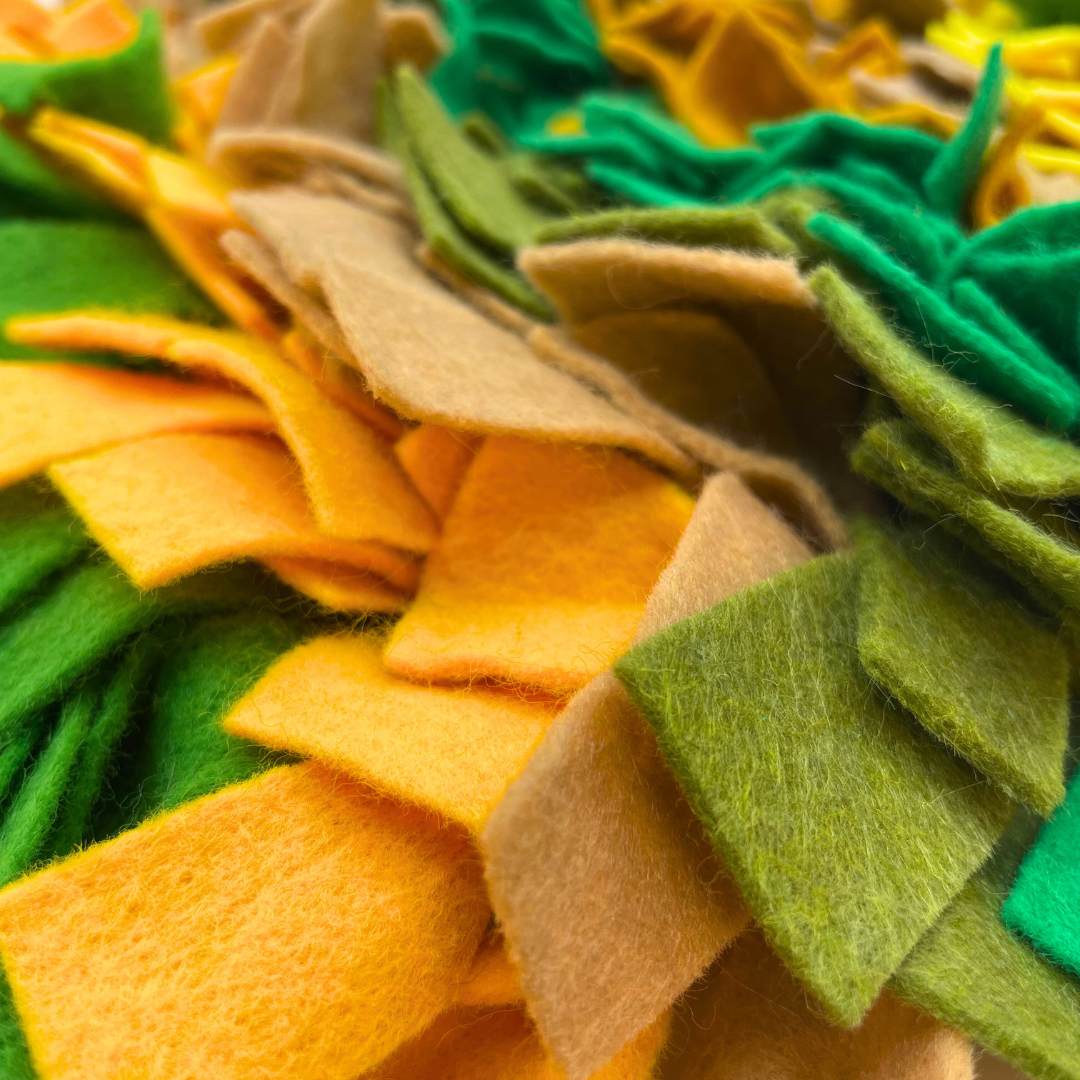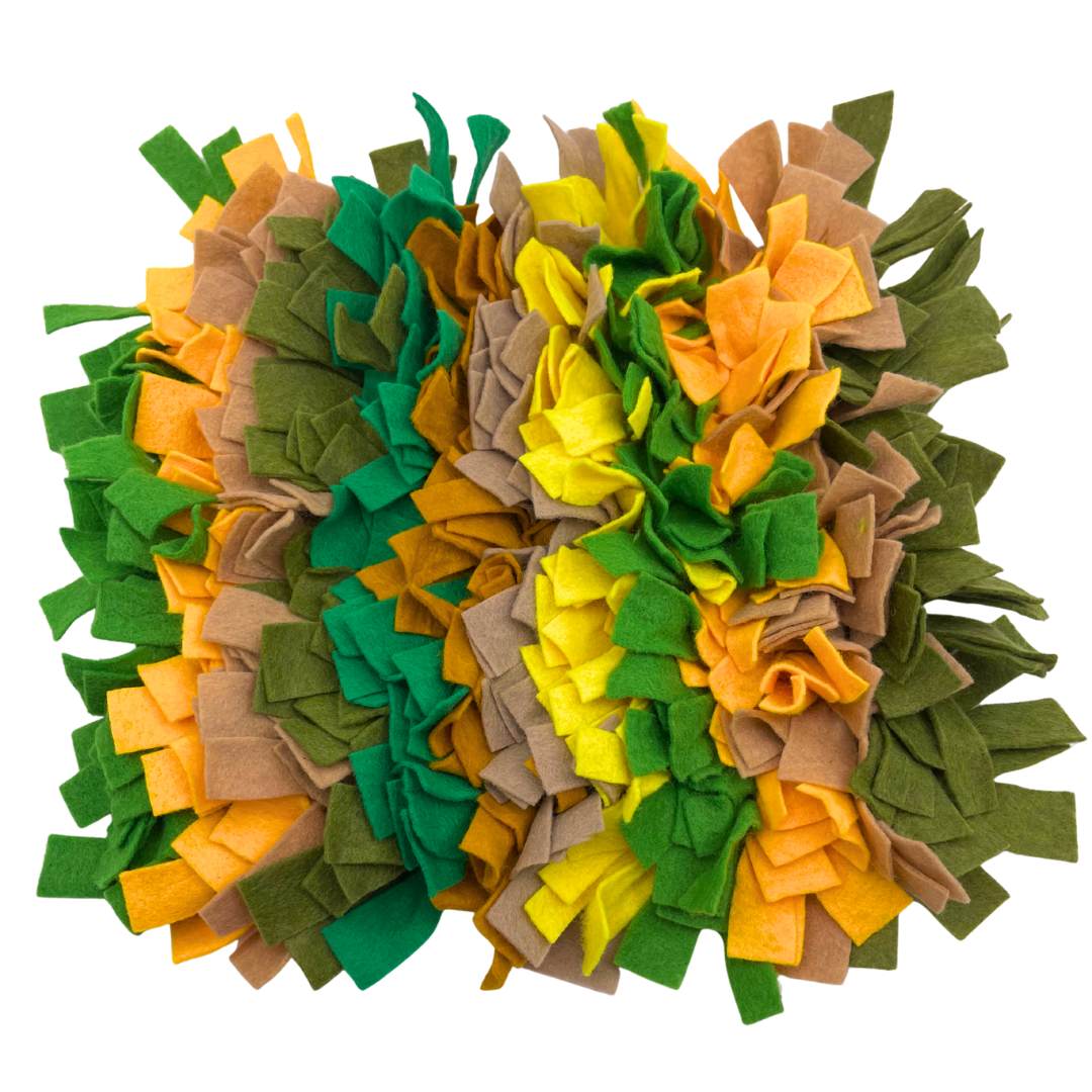 The Link Snuffle Mat is here for all your fabulous dog's foraging needs! This 10.5" by 12" mat has Olive Green, Yellow, Mustard, Tan, and Forest Green felt straps woven into a plastic mat for bright feeding fun. You can use The Link Snuffle Mat during feeding, training, relaxing, or enrichment time. Simply put yummies for your dog to snuff out in between the felt strips and watch them go. Don't forget to check out our Treat Shop for snacks to load into your new Snuffle Mat!