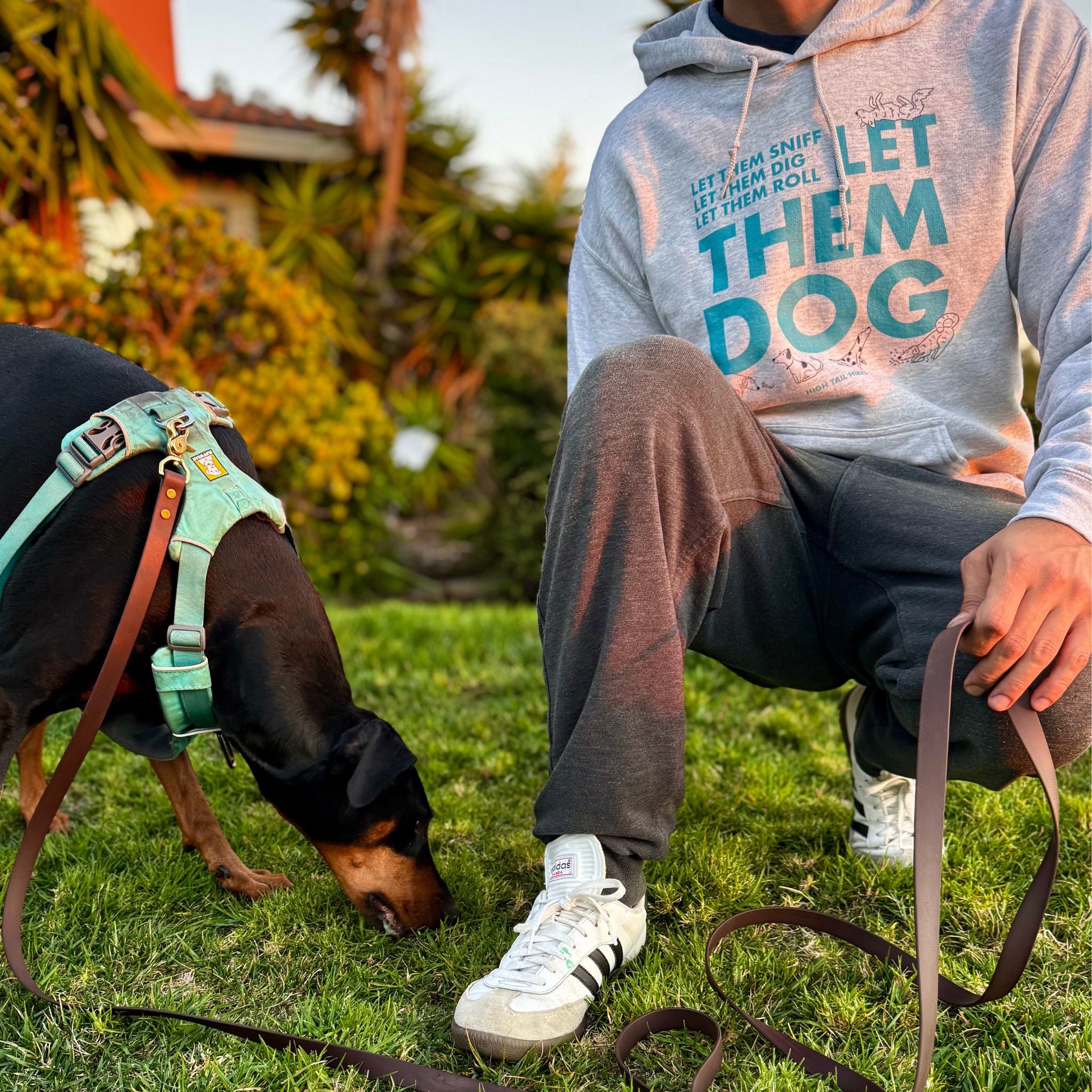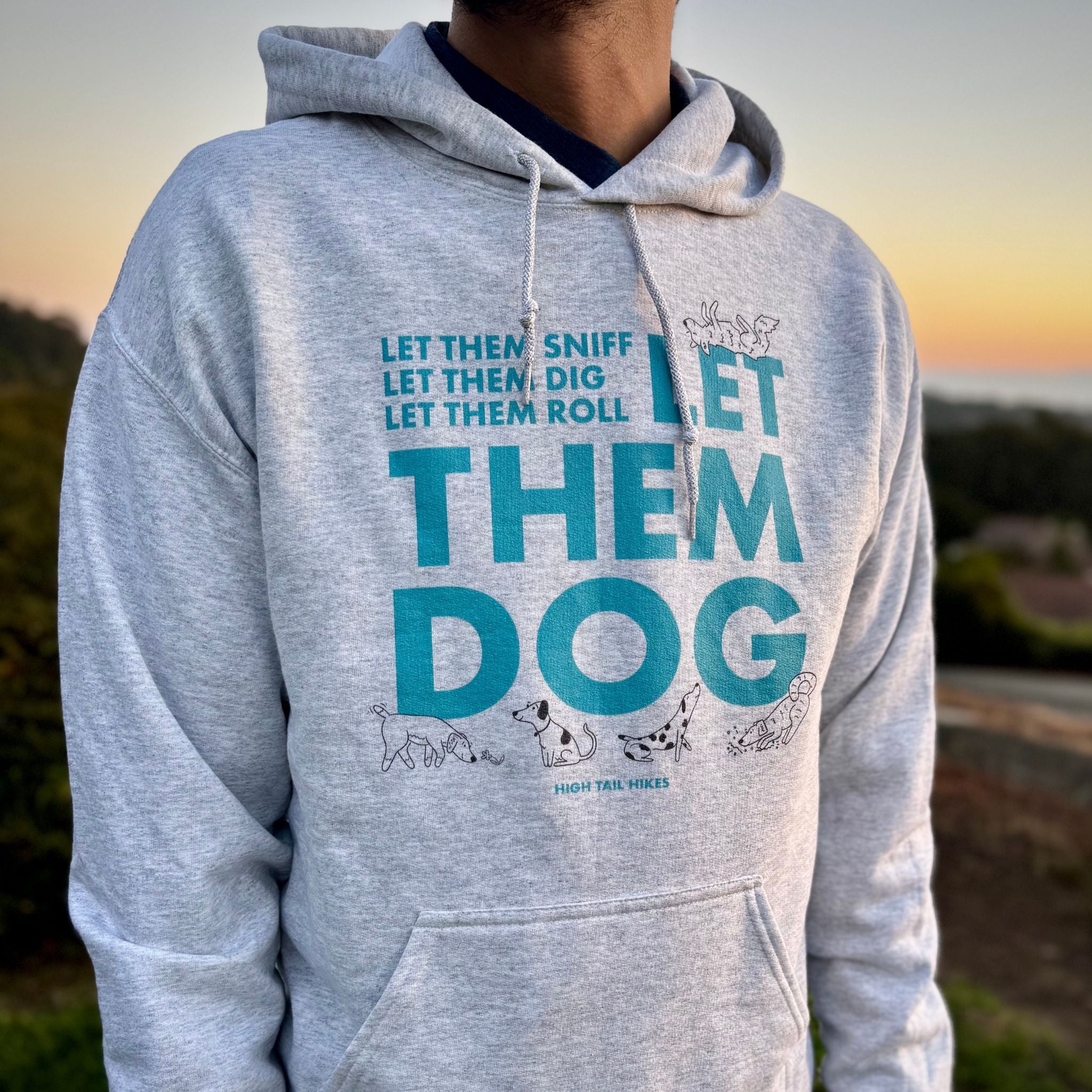 This hoodie embodies our unofficial motto - a cozy, wearable reminder to let dogs be dogs. Perfect for cool mornings, couch cuddles, or gifting to the compassionate dog lover in your life. With bold blue lettering and hand drawn dogs. Designed and drawn by Adam Planas for High Tail Hikes.