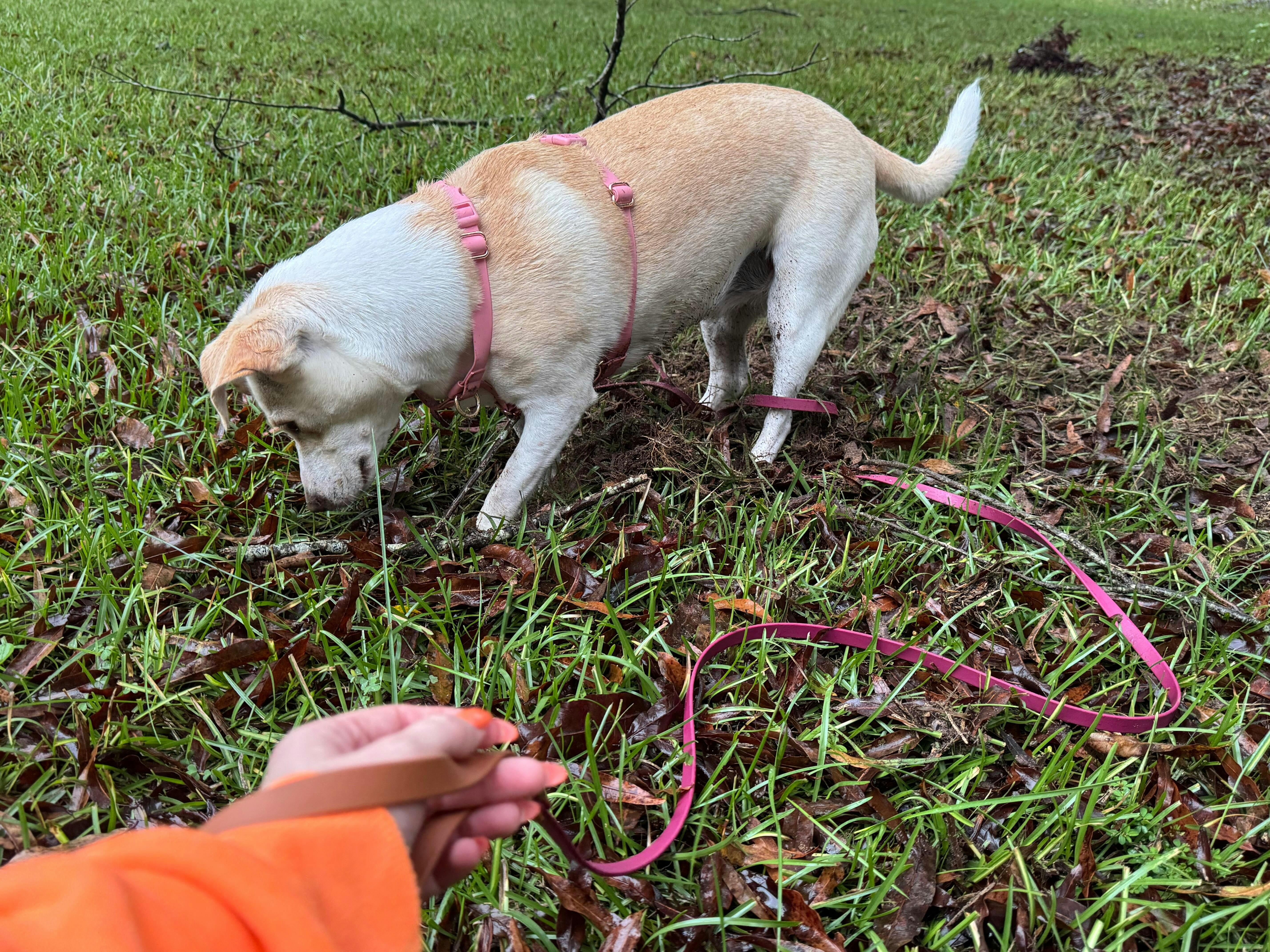 My mom lets me get into all of my favorite things with this leash! She lets me dig and throw mud on it, roll around in funky smells and take long walks in the rain because she can wipe it down and it’s like new again!