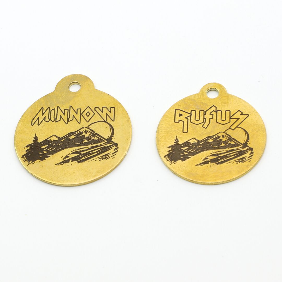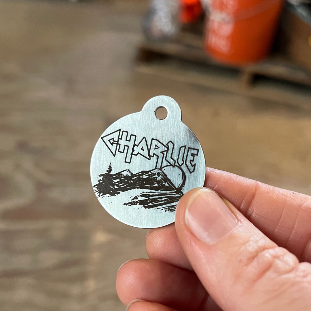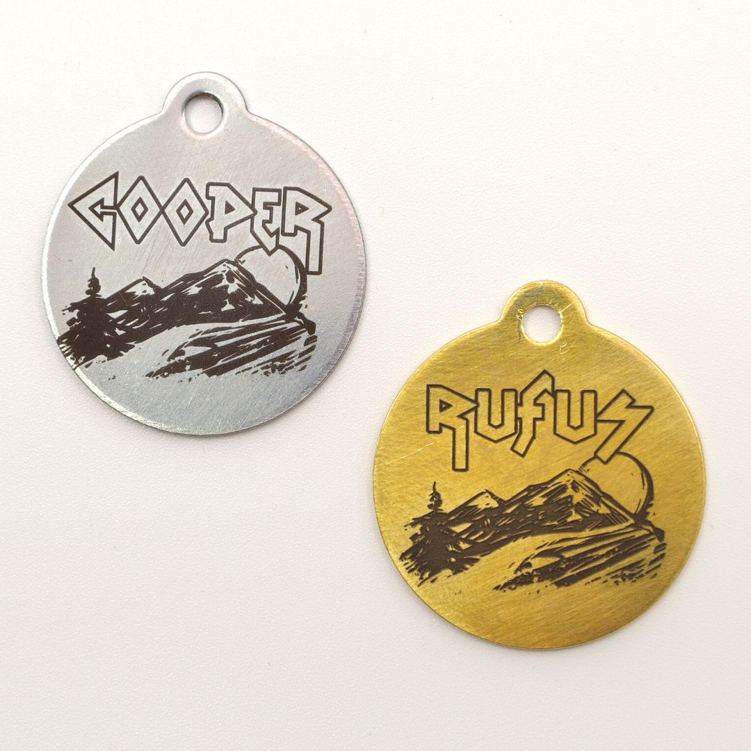 Our Mountain Metal Dog ID Tag features a beautiful mountain graphic by local East Bay artist Wythe Bowart and your dog’s name in “Heavy Metal” script on the front. Choose your font for up to four lines of text on the back.