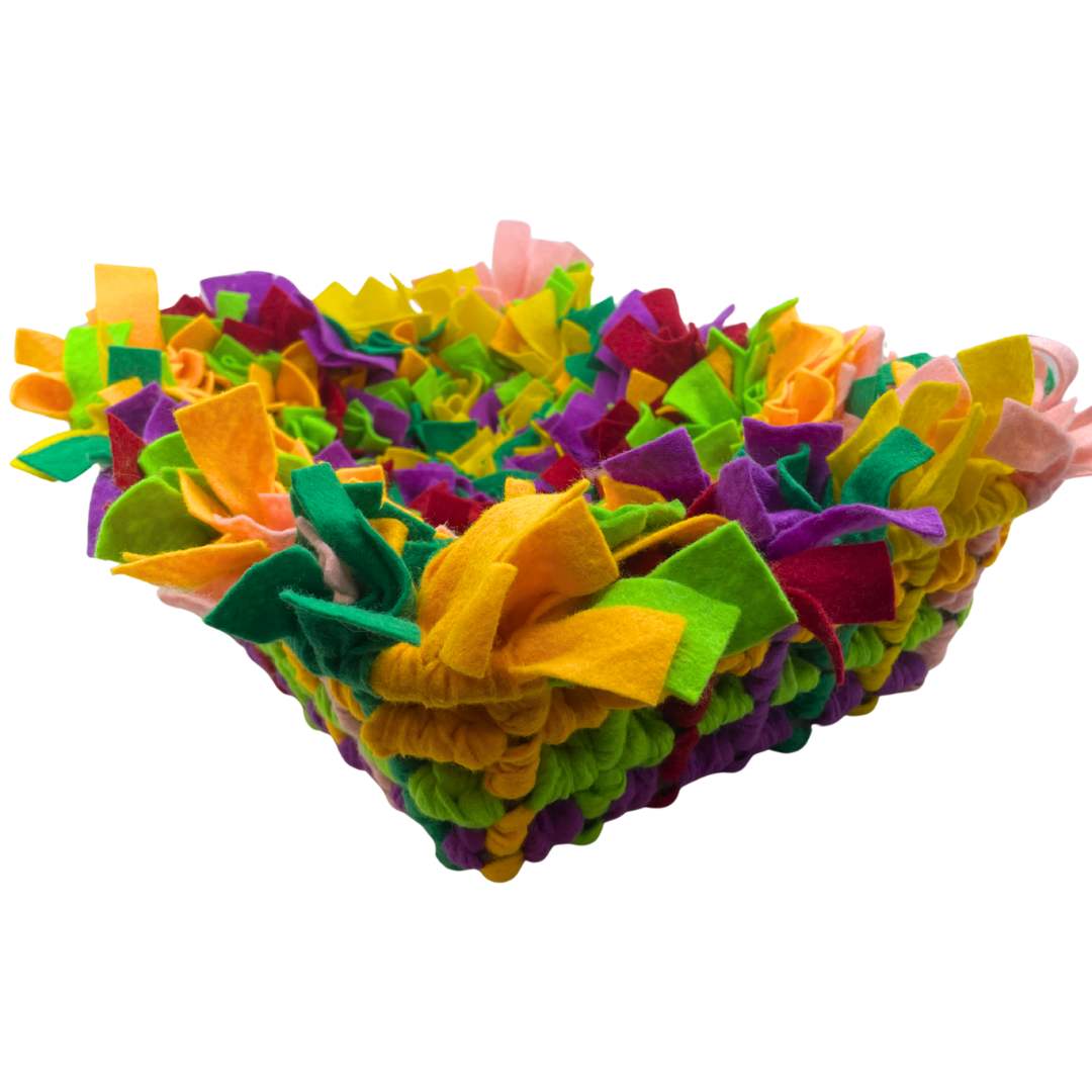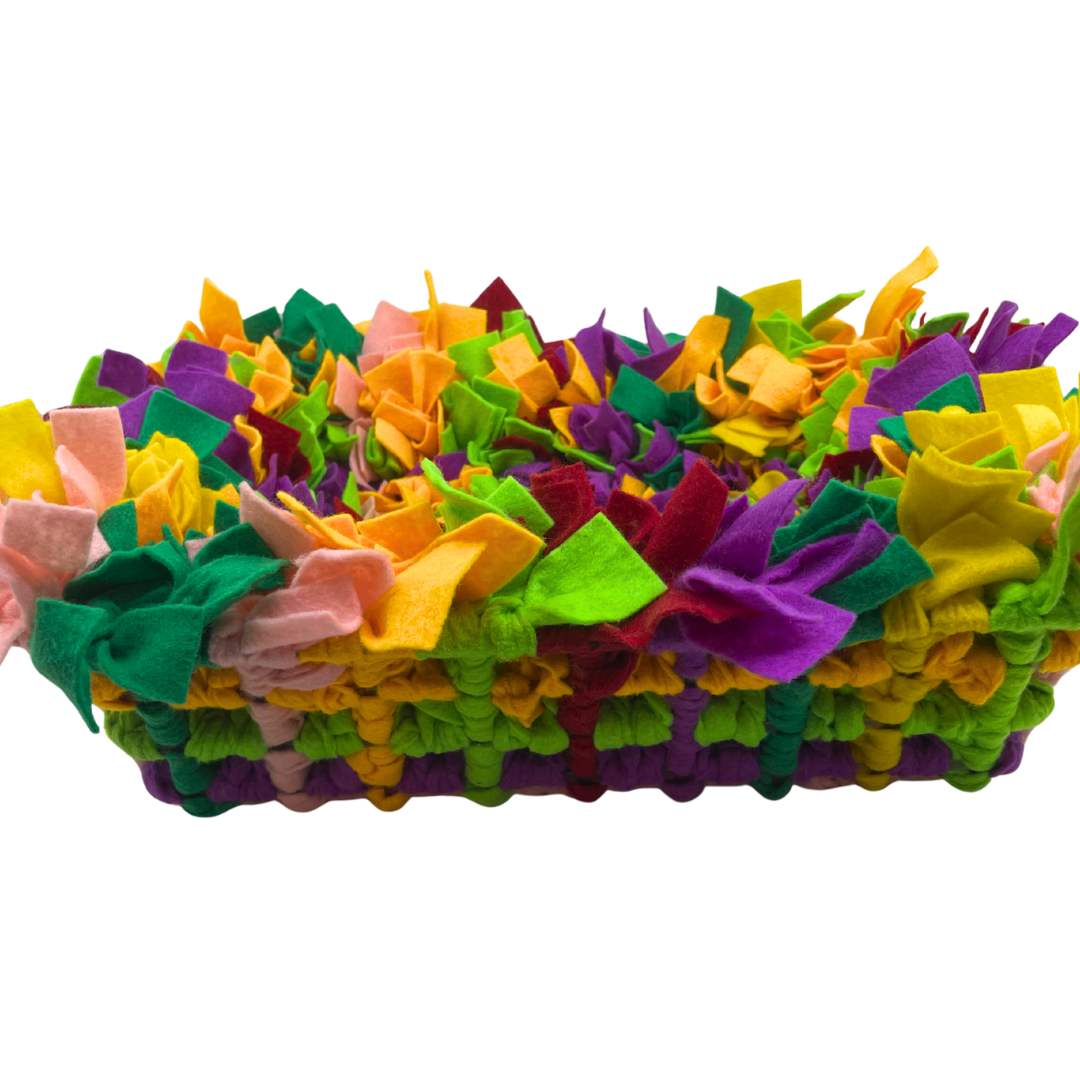 The Lets Go to the Garden Snuffle Basket is here for all your fabulous dog's foraging needs! This 10" x 14" x 3.5" basket has Bright Green, Forest Green, Pink, Yellow, Purple, and Red felt straps woven into a plastic basket for bright feeding fun. You can use the Lets Go to the Garden Snuffle Basket during feeding, training, relaxing, or enrichment time. Simply put yummies for your dog to snuff out in between the fleece strips and watch them go. Don't forget to check out our Treat Shop for snacks to load into your new Snuffle!