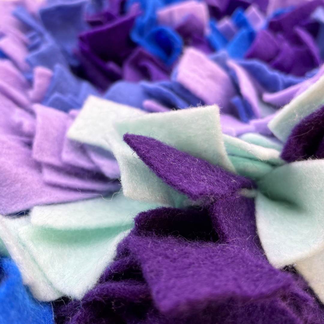 The Purple Rain Snuffle Mat is here for all your fabulous dog's foraging needs! This 12" by 16" mat has a variety of Purple and Blue felt straps woven into a plastic mat for bright feeding fun. You can use The Purple Rain Snuffle Mat during feeding, training, relaxing, or enrichment time. Simply put yummies for your dog to snuff out in between the felt strips and watch them go. Don't forget to check out our Treat Shop for snacks to load into your new Snuffle!