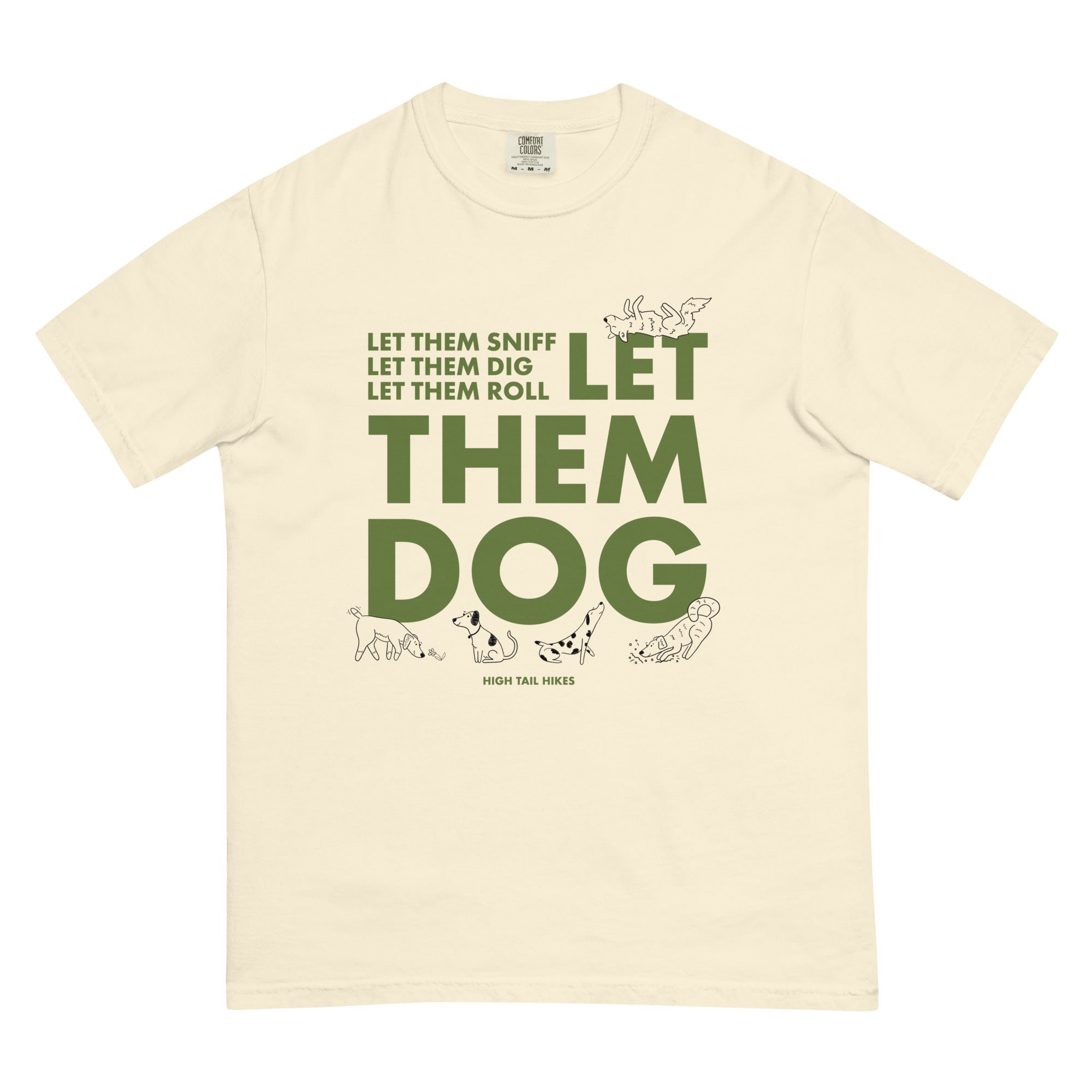 This tee embodies our unofficial "Let Them Dog" motto in an earthy green with hand drawn dogs. If you’re looking for a thick, structured tee that’s also super soft and breathable - look no further! The unisex garment-dyed heavyweight t-shirt ticks all the boxes and is made of 100% ring-spun cotton. Designed and drawn by Adam Planas for High Tail Hikes.