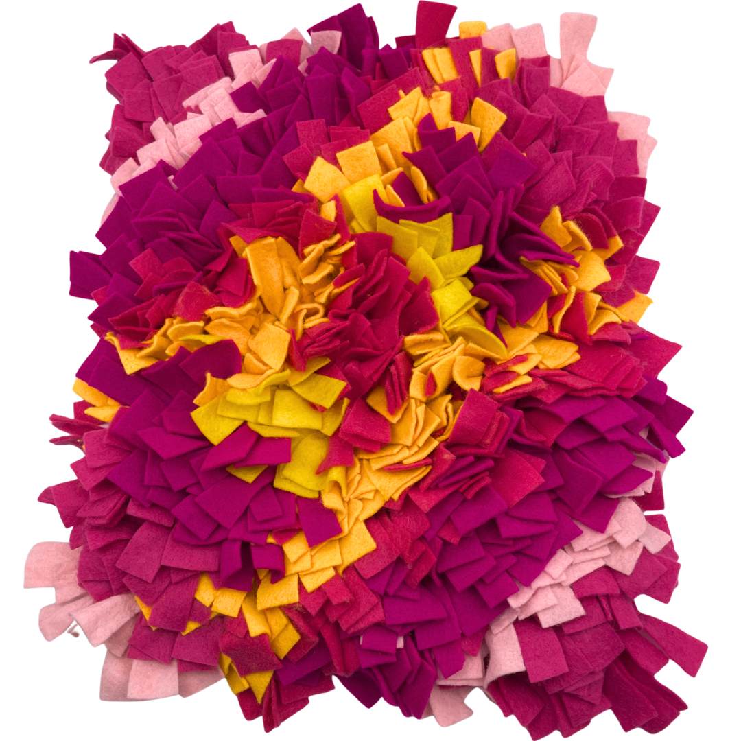 The Princess Bubblegum Snuffle Mat is here for all your fabulous dog's foraging needs! This 12" by 16" mat has a variety of pink and yellow felt straps woven into a plastic mat for bright feeding fun. You can use The Princess Bubblegum Snuffle Mat during feeding, training, relaxing, or enrichment time. Simply put yummies for your dog to snuff out in between the felt strips and watch them go. Don't forget to check out our Treat Shop for snacks to load into your new Snuffle!