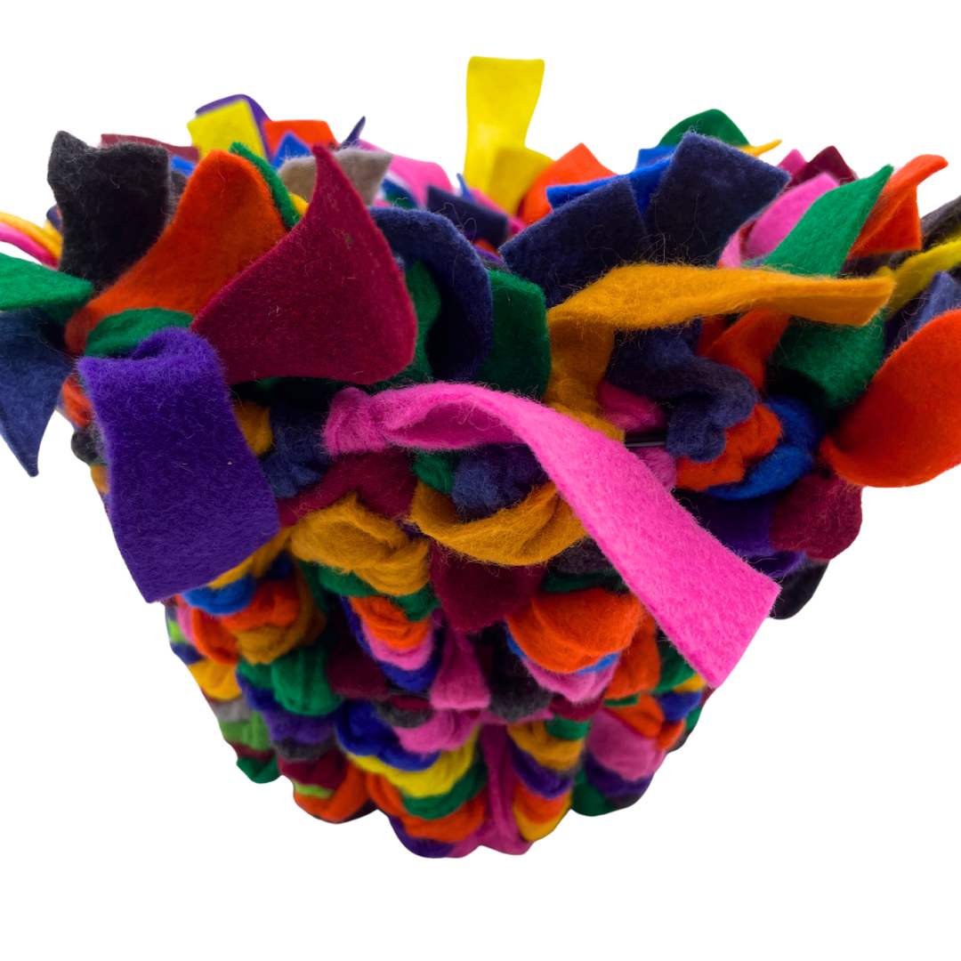 The Mini Party Snuffle Basket is here for all your fabulous dog's foraging needs! This 8" x 8" x 5" basket has a variety of colors of felt straps woven into a metal wire basket for bright feeding fun. You can use the Mini Party Snuffle Basket during feeding, training, relaxing, or enrichment time. Simply put yummies for your dog to snuff out in between the fleece strips and watch them go. Don't forget to check out our Treat Shop for snacks to load into your new Snuffle!